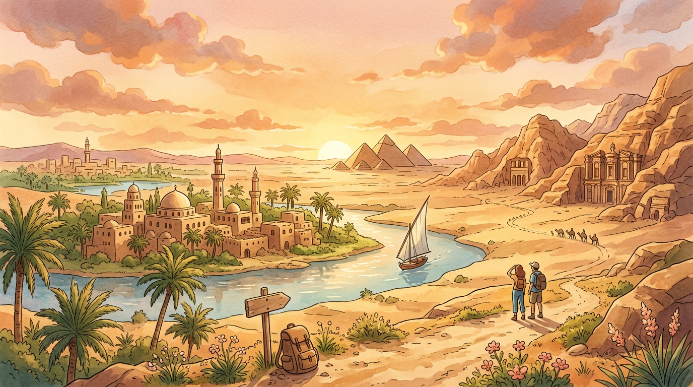 Dining in the MENA region is a deeply communal experience where food is an expression of hospitality. In Jordan, do not miss Mansaf, a traditional lamb dish cooked in fermented dried yogurt, usually served on a large platter for everyone to share. In Egypt, a bowl of Kushari—a hearty mix of pasta, rice, lentils, and spicy tomato sauce—will cost you roughly 30 EGP ($0.60 USD) and keep you fueled for a day of exploring the Pyramids.